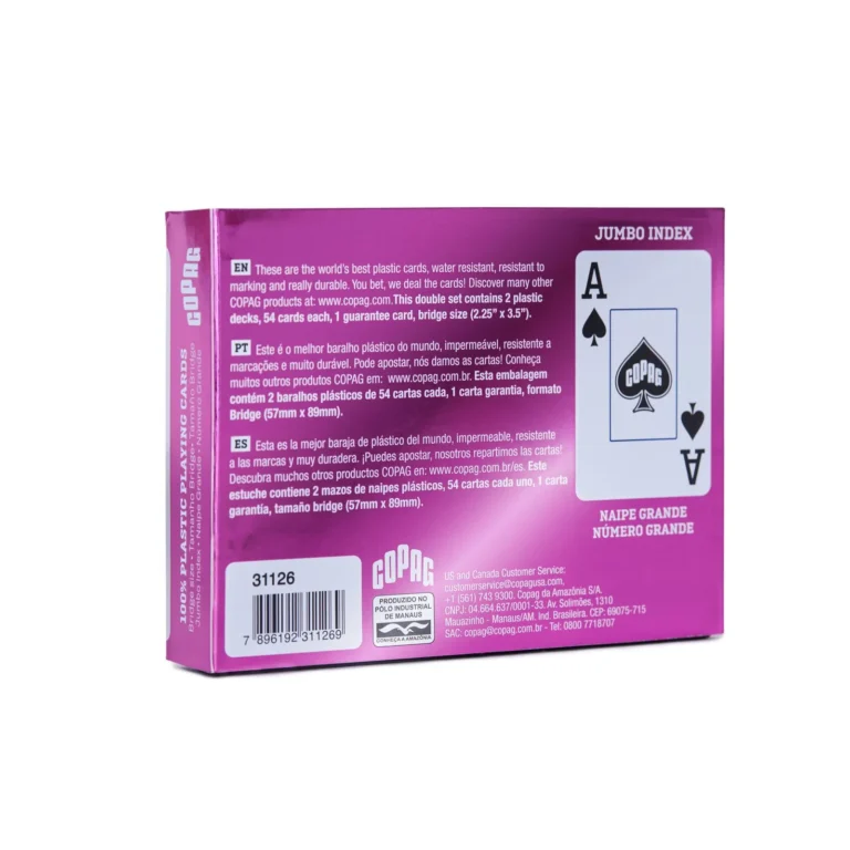 - Resistência: por ser 100% plástico, as cartas não amassam facilmente, não mancham com líquidos e duram muito mais que baralhos de papel