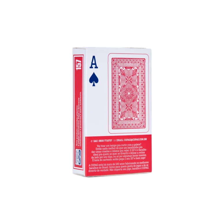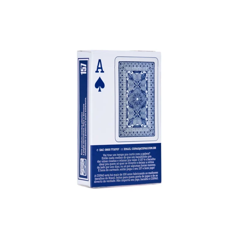 Fabricado pela Copag — uma das maiores fabricantes de baralhos do mundo, com exportação para mais de 50 países — o modelo 157 é conhecido pela durabilidade, pelo toque agradável e pela confiabilidade em partidas sérias ou naquelas jogatinas descontraídas de fim de semana.