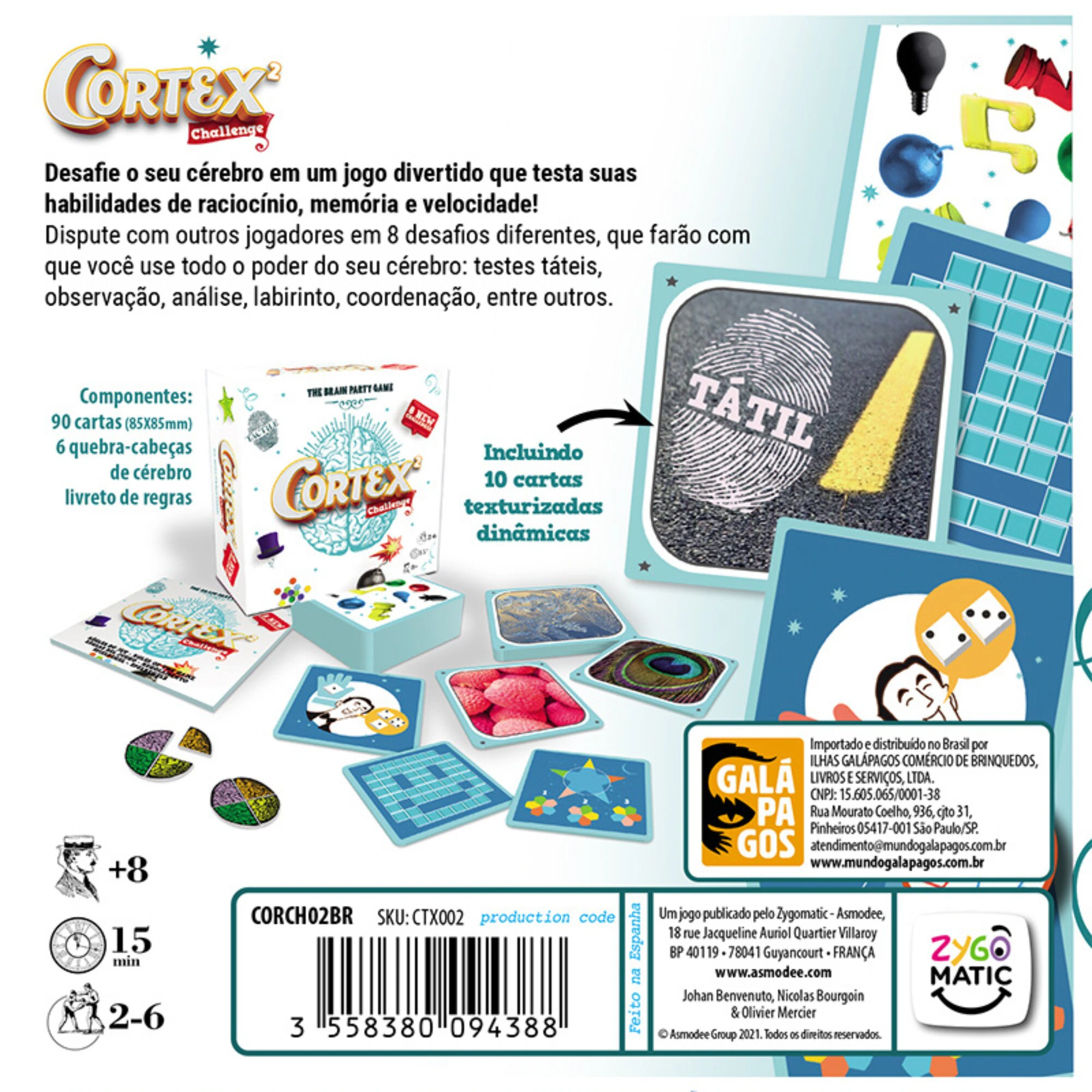 Nesse jogo rápido e inteligente, os jogadores competem para resolver desafios dos mais inusitados, que se dividem em 8 tipos, como lembrar todas as figuras que a carta contém, realizar desafios táteis, raciocínio lógico e muitos outros. Em Cortex Challenge 2 você encontra desafios de tato com cartas texturizadas dinâmicas.