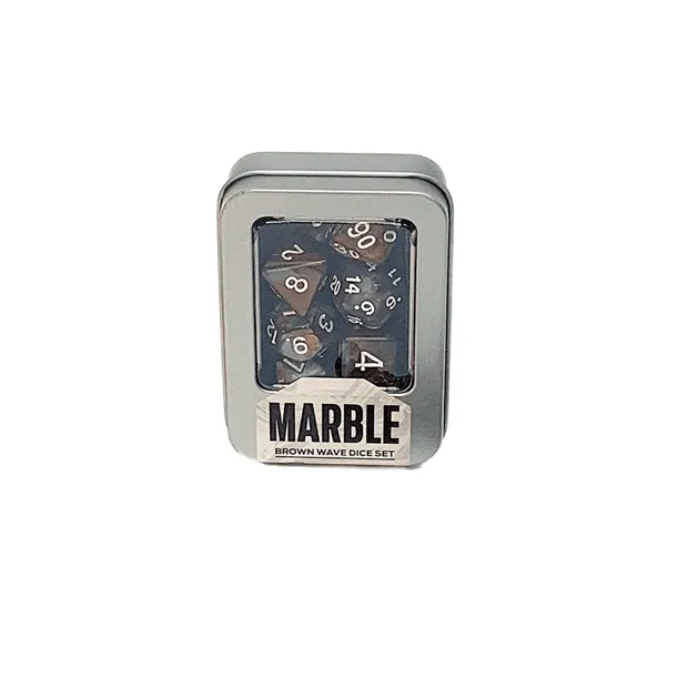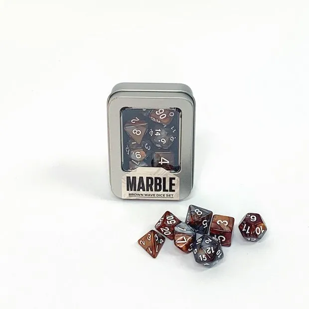 Kit de dados marmorizados da linha MARBLE WAVE na cor MARROM contendo os principais dados para jogar os mais conhecidos sistemas de RPG.