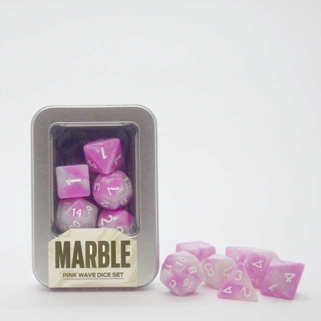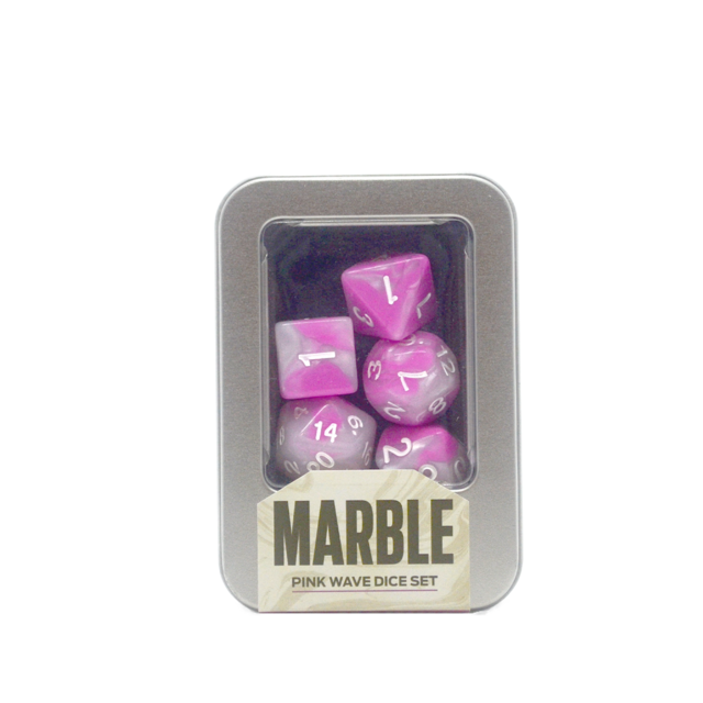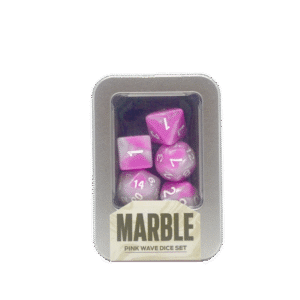 Kit de dados marmorizados da linha MARBLE WAVE na cor ROSA contendo os principais dados para jogar os mais conhecidos sistemas de RPG.