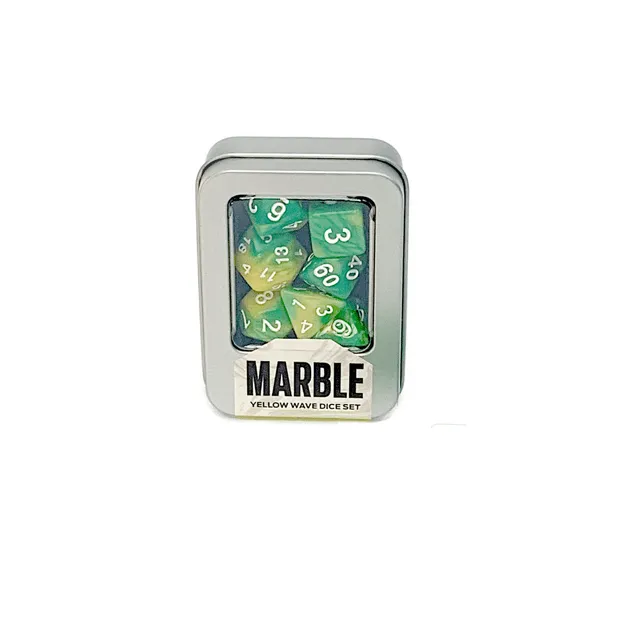 Kit de dados marmorizados da linha MARBLE WAVE na cor AMARELA contendo os principais dados para jogar os mais conhecidos sistemas de RPG.